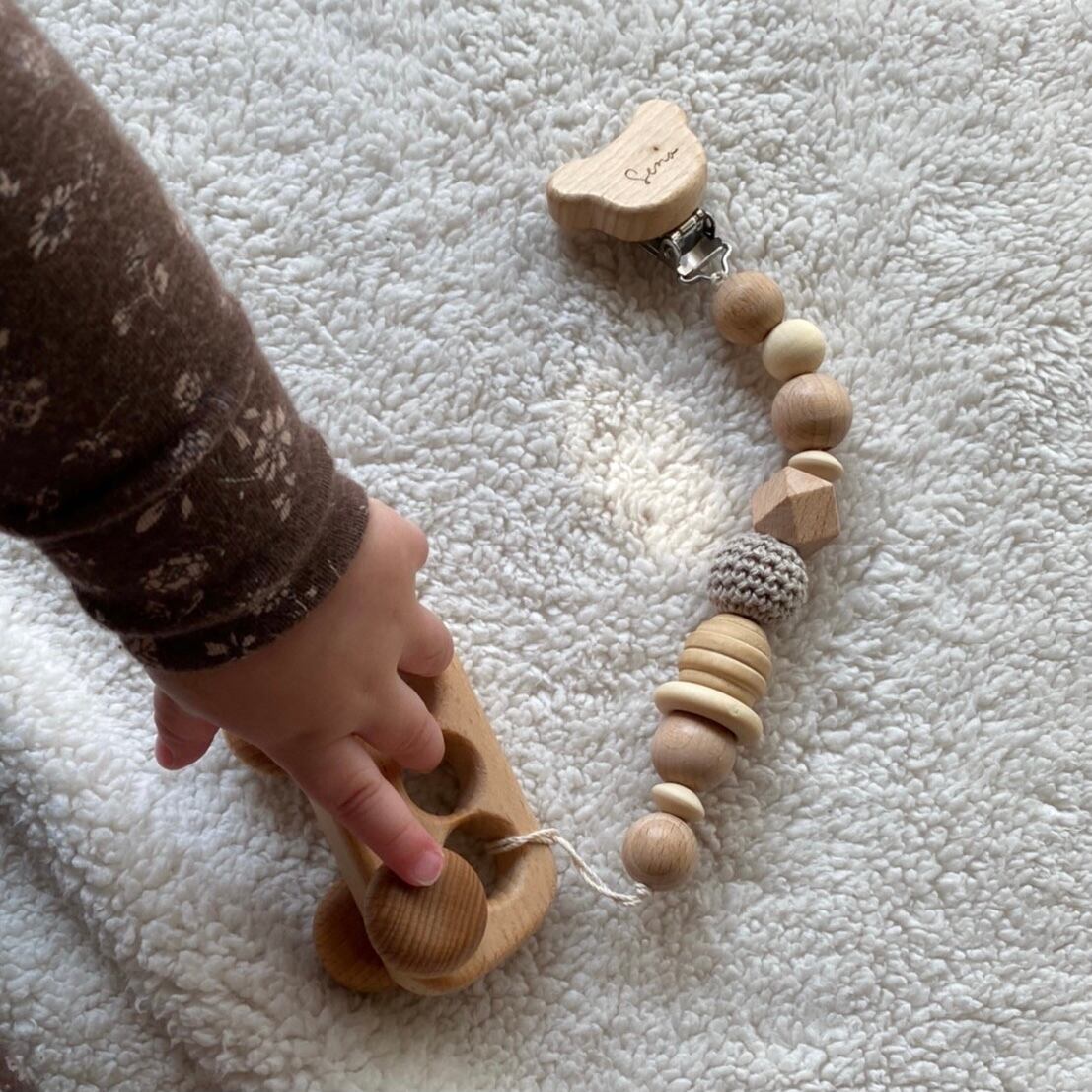 おしゃぶりだけでなく、玩具やお菓子ケースなど取り付けるとお出掛け時に床に落とす事なく衛生的かつ便利なアイテムとなっております。