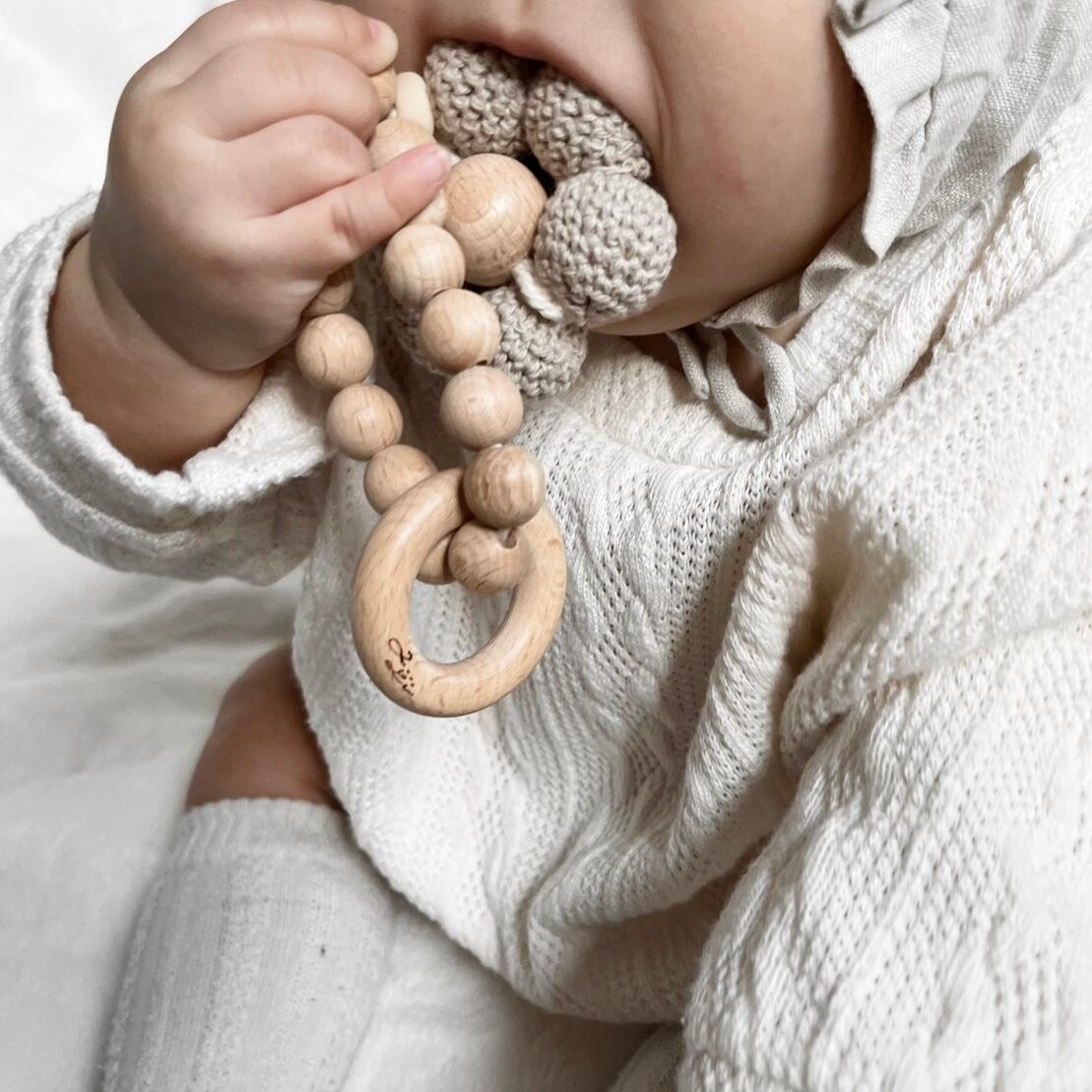 木製リングも付いているのでカタカタと優しい音の鳴る仕様でお口に入れても安心安全の素材ですので、赤ちゃんも楽しく遊んでいただけます ⸝⸝⸝⸝